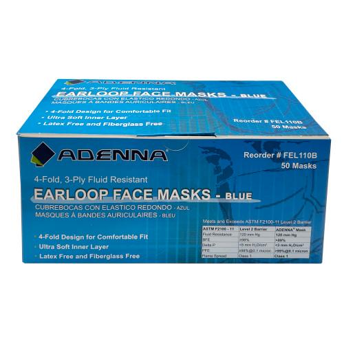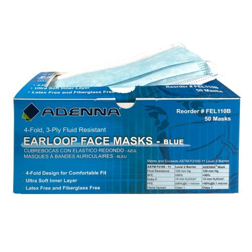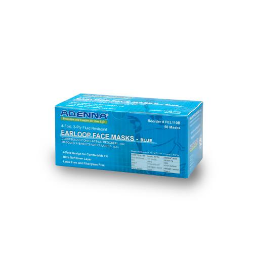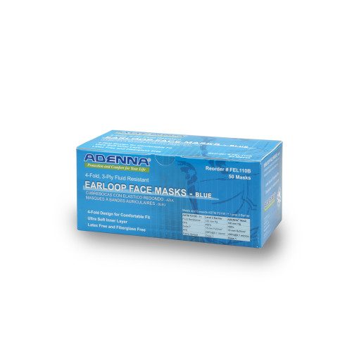 These 3-ply fluid resistant earloop face masks have a unique 4-fold design, which is different from traditional 3-fold face masks. More protective material is used in creating a 4-fold design than traditional 3-fold face masks; therefore when unfolded, the ADENNA face masks form a better cone shape to provide maximum coverage on the wearer. The inner layer touching the wearer’s face is a unique material that is ultra soft and very comfortable on the skin. These face masks are 100% latex free and fiber glass free. The nose piece is metal free but conforms to wearer’s face for a comfortable fit.
