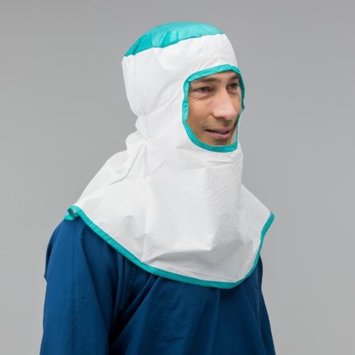 Sterile SMS Cleanroom Hood, Open Face, White, Small/Medium - Large/X-Large These sterile hoods are composed of a heavy weight, non-woven, SMS material that is extremely low in particulate shedding and ideal for applications where maximum protection to product or personnel is required. They provide impervious barrier and excellent liquid repellence, especially to chemicals. The disposable hoods are designed for use in ISO 5 (Grade A/former Class 100) controlled environments. A face mask is integrated for added convenience and is constructed of a three layer polypropylene material with excellent bacterial and particle filtration efficiency. Hoods are cleanly folded to reduce operator contamination and reduce gowning time.