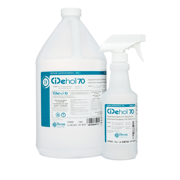 CiDehol® 70 is a 70% USP isopropyl alcohol solution that is filtered to 0.2µm and packaged in ready-to-use trigger spray bottles or one, 5 or 55-gallon drums. CiDehol® 70 can be used to clean surfaces and hoods in microbiology labs and tissue culture labs. It is also effective in cleaning surfaces and process equipment in pharmaceutical, biotechnology, medical devices, cosmetic and food production areas. IPA solution evaporates away completely so no rinse is required.