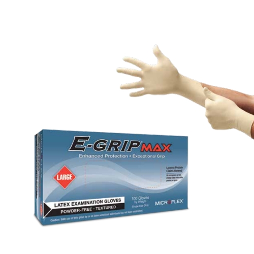 Microflex E-Grip Max Powder-Free Examination Gloves are ultra-durable latex exam gloves that have added thickness for extra protection. Fully textured fingers offer enhanced gripping power in every situation. 510K approved for medical use.