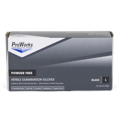 ProWorks Black Nitrile Exam Gloves, Powder-Free, 5 mil (HOS-GL-N145F). These black nitrile examination grade gloves are 5 mil, offering excellent durability and protection. They are ideal for a variety of applications including medical/exam, industrial, food processing, forensics/crime scene processing, and more. ProWorks Black Nitrile Exam Gloves provide superior puncture, tear and chemical resistance when compared to latex gloves. The textured surface provides strong grip for both wet and dry applications. They are sold by the case - packaged 100/box, 10 boxes/case, 1000 total gloves per case.