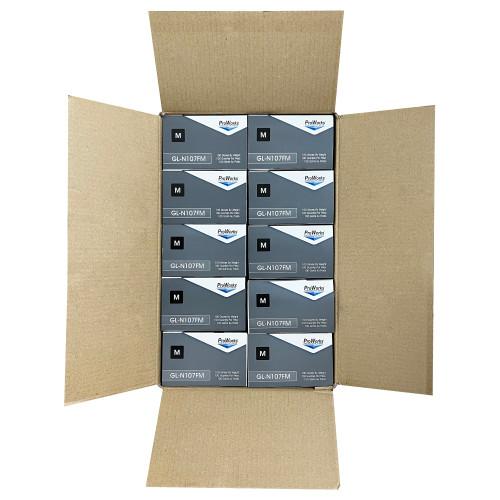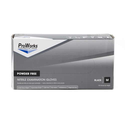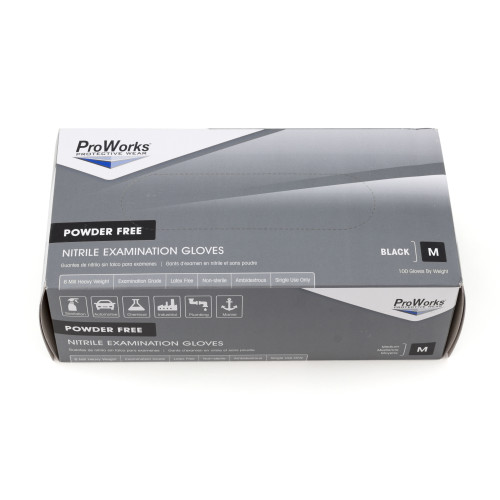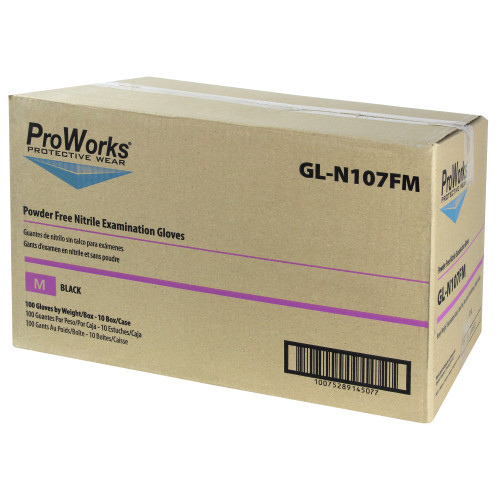 ProWorks Black Nitrile Exam Gloves, Powder-Free, 7 mil (GL-N107F). These heavy-weight 7 mil gloves offer excellent durability, making them ideal for medium to heavy-duty industrial applications like automotive painting, construction, maintenance, janitorial services, production and assembly line. They protect hands against a variety of chemicals & blood-borne pathogens. The distinct black color makes this glove a perfect choice to resist stains. These 7 mil black nitrile gloves have a textured surface that provides excellent grip. The textured surface provides strong grip for both wet and dry applications. They are sold by the case - packaged 100/box, 10 boxes/case, 1000 total gloves per case.