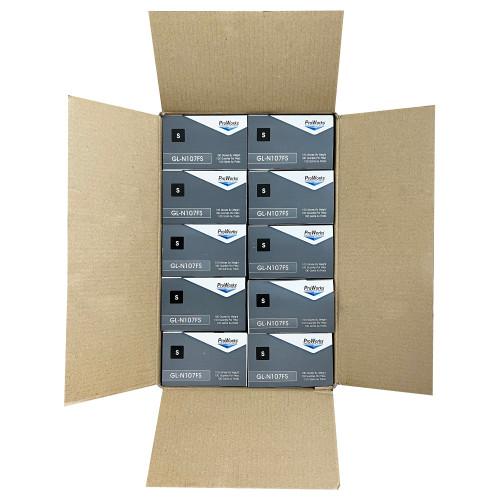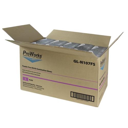 ProWorks Black Nitrile Exam Gloves, Powder-Free, 7 mil (GL-N107F). These heavy-weight 7 mil gloves offer excellent durability, making them ideal for medium to heavy-duty industrial applications like automotive painting, construction, maintenance, janitorial services, production and assembly line. They protect hands against a variety of chemicals & blood-borne pathogens. The distinct black color makes this glove a perfect choice to resist stains. These 7 mil black nitrile gloves have a textured surface that provides excellent grip. The textured surface provides strong grip for both wet and dry applications. They are sold by the case - packaged 100/box, 10 boxes/case, 1000 total gloves per case.