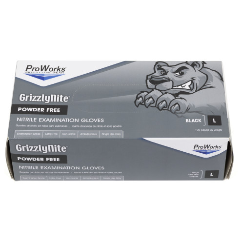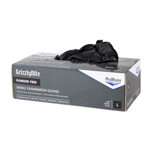 ProWorks GrizzlyNite Nitrile Exam Gloves, Powder-Free, 5.5 mil (HOS-GL-N105F). These gloves are strong and durable (5.5 mil) and protect hands against a variety of chemicals & blood-borne pathogens. The distinct black color makes this glove a perfect choice to resist stains. The gloves textured surface provides excellent grip. ProWorks Black Nitrile Exam Gloves provide superior puncture, tear and chemical resistance when compared to latex gloves. The textured surface provides strong grip for both wet and dry applications. They are sold by the case - packaged 100/box, 10 boxes/case, 1000 total gloves per case.