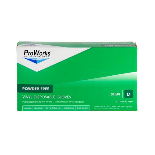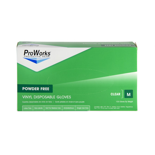 ProWorks Clear Vinyl Gloves, 3 mil (HOS-GL-V103), Available in Powdered or Powder-Free. These are the perfect economical disposable latex gloves, ideal for a variety of applications including food handling/processing, general-purpose cleaning, and light industrial use. Sold by the case - packaged 100/box, 10 boxes/case, 1000 total gloves per case.