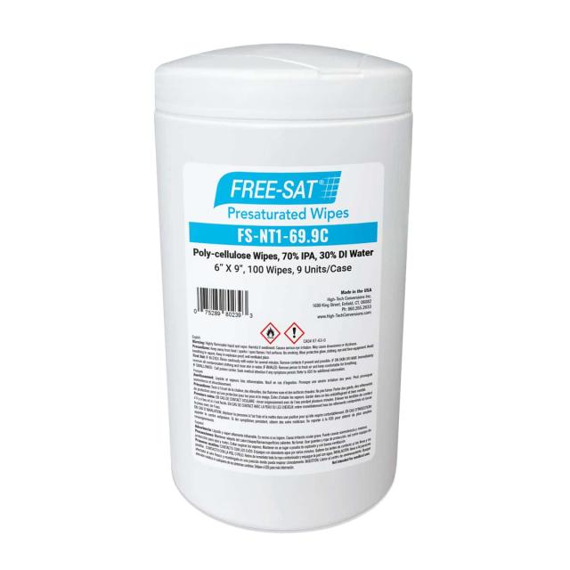 FREE-SAT® 70% IPA / 30% DI Water Presaturated Wipes, Poly-cellulose, 6” x 9”, 100 Wipes/Unit, 9 Units/Case. Designed for precision contamination control, these wipes cater to the stringent needs of the high-tech research and manufacturing sectors that demand the utmost cleanliness with added convenience of a canister wipe. They are ideal for use in ISO Class 6 (Class 1000) Cleanrooms, and can be used in ISO Class 5 (Class 100) Cleanrooms. These presaturated canister wipes are made from a hydroentangled nonwoven material composed of 45% polyester and 55% cellulose. They are tough, abrasion resistant, absorbent, and virtually free of particle generation.