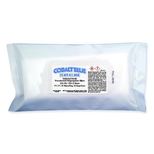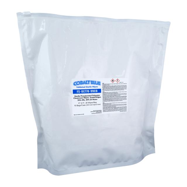 Cobalt Blue Presaturated Sterile Cleanroom Wipes 9" x 9", 70% IPA / 30% DI Water, Item: FS-ULT70-99CB are among the “cleanest” sterile wipes available on the market. These presaturated sterile cleanroom wipes contain four edges that are individually laser cut, with melted and sealed edges to eliminate loose fibers. The FS-ULT70-99CB is currently our lowest-linting wipe option – lowest in particle emission, nonvolatile residue and ionic levels, cleanroom laundered, validated sterile, individually inspected and hermetically packaged in cleanroom bags.