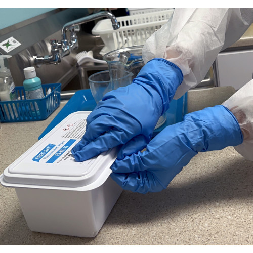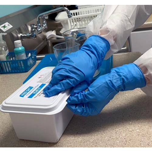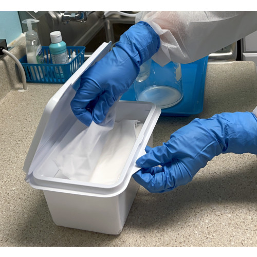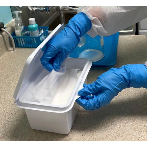 70% Isopropyl Alcohol / 30% DI Water | ISO Class 6 (1000) Cleanroom Wipe | Nonwoven Poly-cellulose FREE-SAT® Pre-saturated IPA (70% IPA, 30% DI Water) wipes have four clean-cut edges as opposed to having long, stringy loose fibers on two sides due to perforating. These wipes are packaged in handy containers that allow the user to open, remove a wipe, and close the container with one hand. Hence freeing up the other hand to hold a circuit board or other item. Wipes are packaged and pre-saturated in tough sealed nylon bags within the container, shelf life is dramatically increased. The fabric itself, NOVA-TECH 1000™, is an especially effective wipe. It is tough, abrasion resistant and virtually free of particle generation and extractable chemical. It is comprised of a synergistic blend of virgin polyester and cellulose that is hydroentangled into a uniform tough fabric. These unique features make NOVA-TECH 1000™ a very effective fabric for IPA wipes.