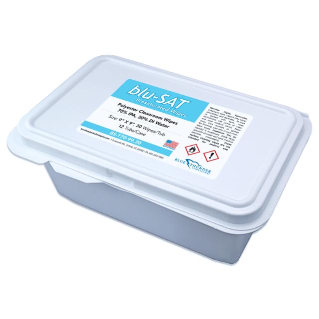 ISO 3-4 / Class 1-10 Cleanroom Wipe | Polyester, Sealed-Edges | 70% Isopropyl Alcohol / 30% DI Water blu-SAT™ BS-T70-99.30 - 9" x 9" polyester wipes, featuring sealed-edges, presaturated with 70% IPA / 30% DI Water. These wipes contain four individually laser cut edges that are melted & sealed to eliminate loose fibers. 70% IPA saturation provides just the right amount of solvent for a variety of cleanroom wiping applications.
