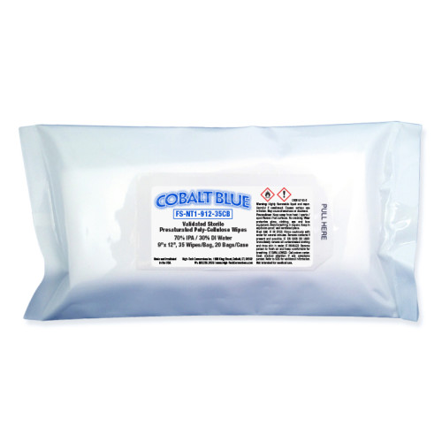 Cobalt Blue Pre-saturated Sterile Cleanroom Wipes 9" x 12" – Nonwoven Poly-cellulose blend, saturated with 70% IPA / 30% DI Water. These 9" x 12" validated sterile pre-saturated cleanroom wipes are constructed of low-linting nonwoven poly-cellulose and are suitable for class 100 cleanrooms and higher. Our Cobalt Blue Pre-saturated Sterile Cleanroom Wipes 9 x 11 contain four clean-cut edges to eliminate fiber contamination. Cobalt Blue Sterile Cleanroom Wipes are designed to meet the requirements set forth by USP 797 and USP 800 for sterile preparations in pharmaceutical compounding settings.