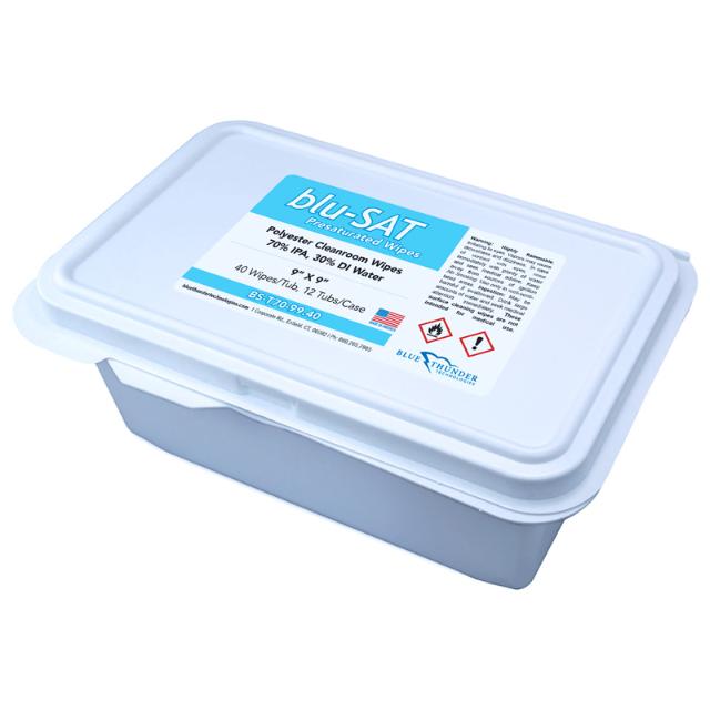 blu-SAT BS-T70-99.40 – 9" x 9" polyester-knit wipes containing four sealed-edges, presaturated with 70% IPA / 30% DI Water. These wipes contain four individually laser cut edges that are melted & sealed to eliminate loose fibers. 70% IPA provides just the right amount of saturation for a variety of wiping applications.